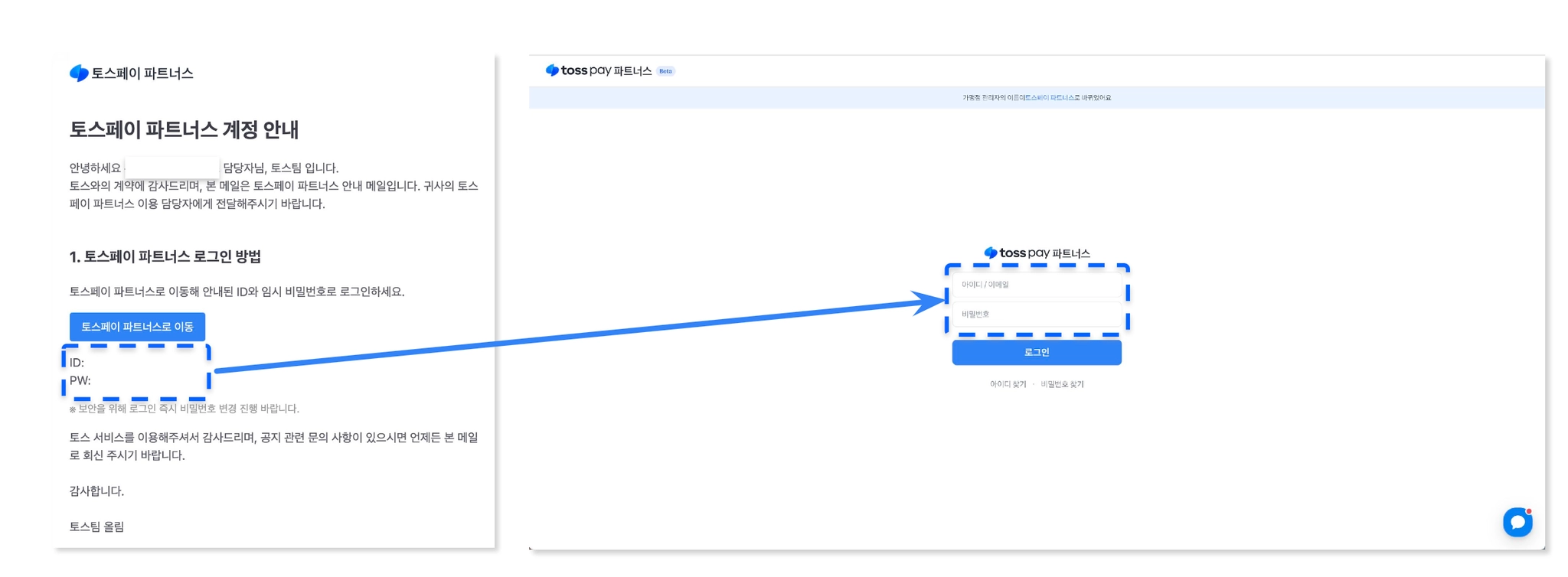 토스페이파트너스로 이동하여 발급 받으신 계정 정보로 로그인해 주세요. 보안을 위해 이메일 2차 인증을 진행해요.