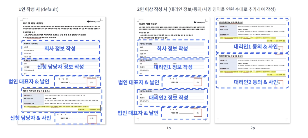 토스페이파트너스 계정을 발급 받기 위해서는 먼저 대리인 위임장 작성이 필요해요.