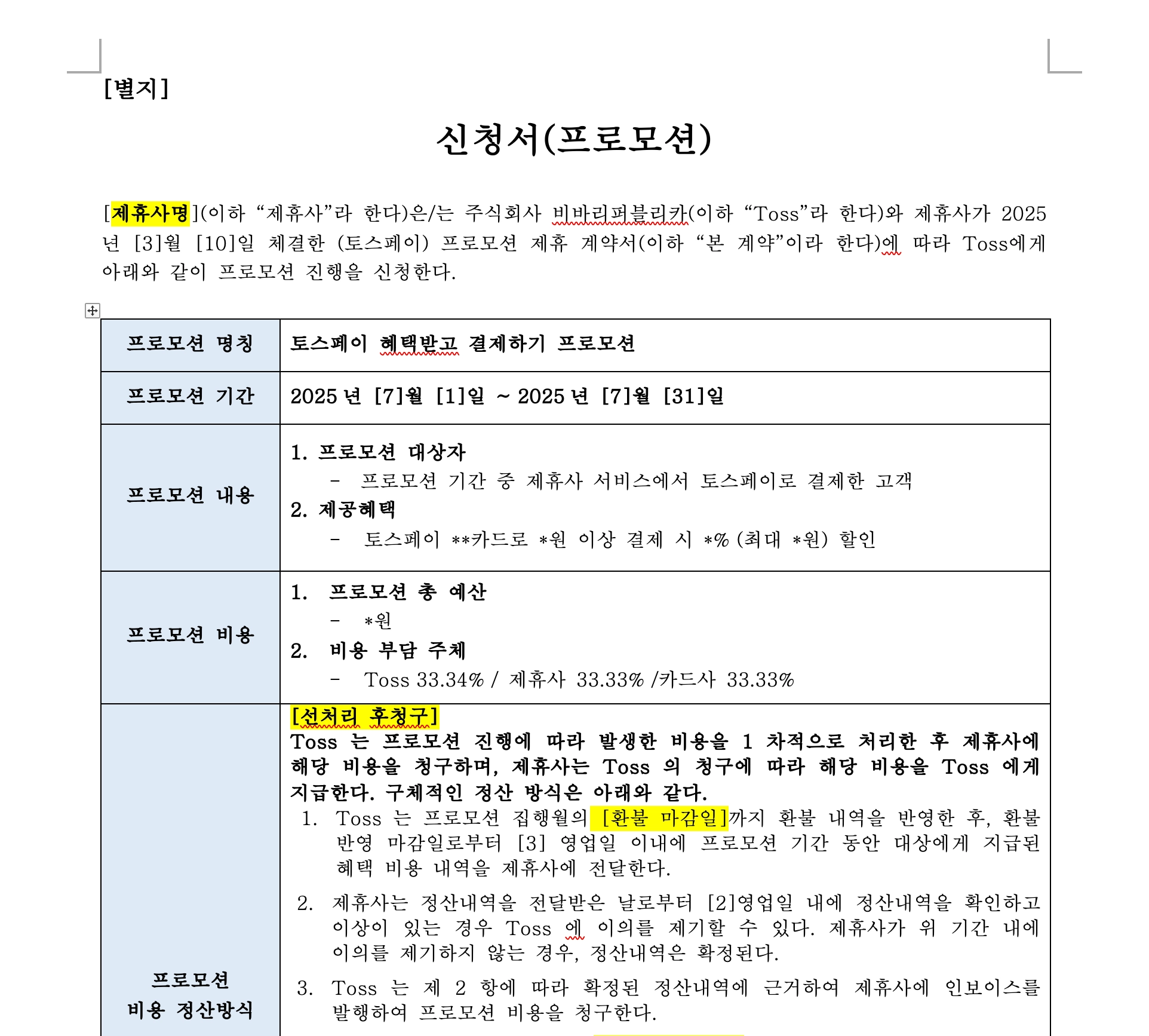 1.     Toss는 프로모션 집행월의 [환불 마감일]까지 환불 내역을 반영한 후, 환불 반영 마감일로부터 [3] 영업일 이내에 프로모션 기간 동안 대상에게 지급된 혜택 비용 내역을 제휴사에 전달한다.