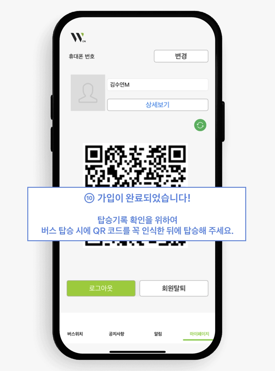 회원가입 후 앱에서 확인 가능한 QR 코드를 리더기에 인식해야만 셔틀버스 탑승이 가능합니다.