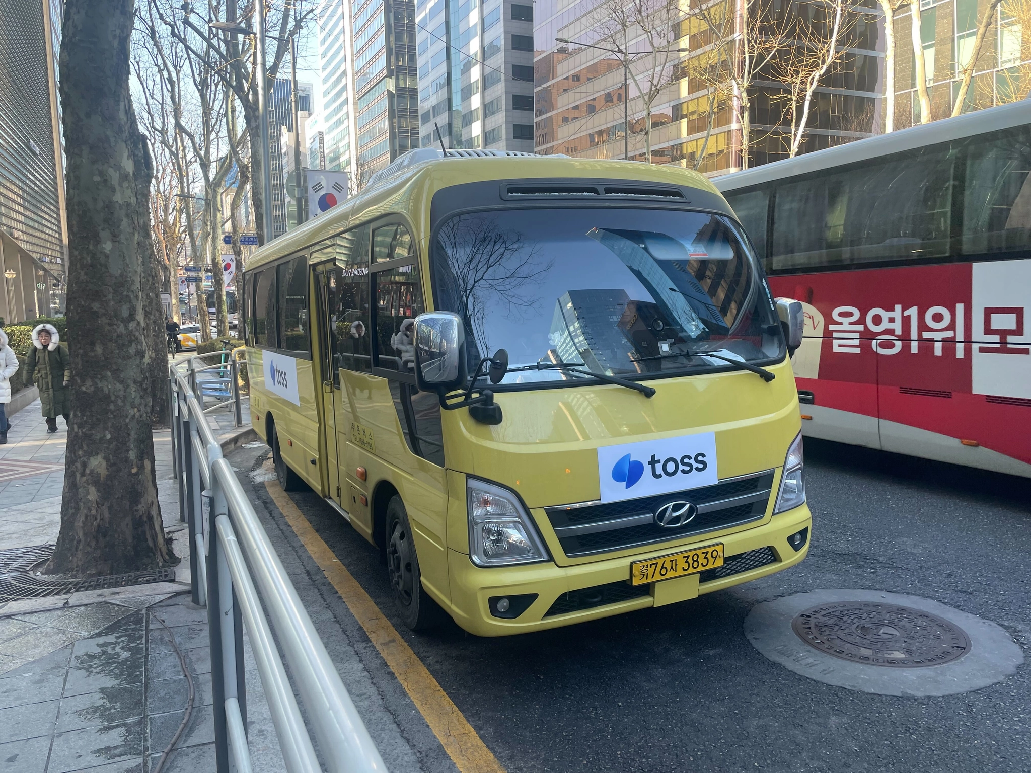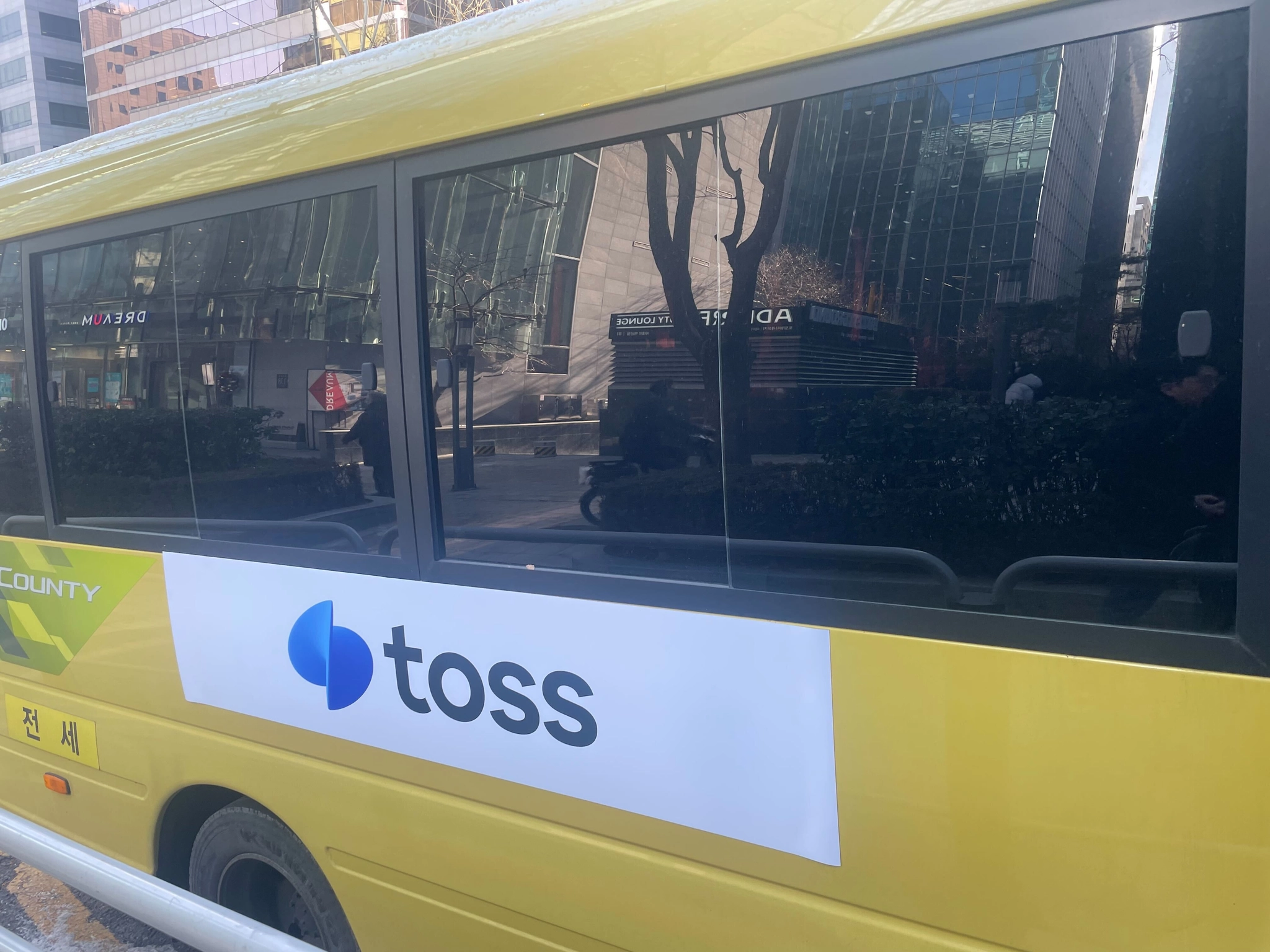 토스 셔틀버스에는, toss 로고가 부착되어 있어요!
