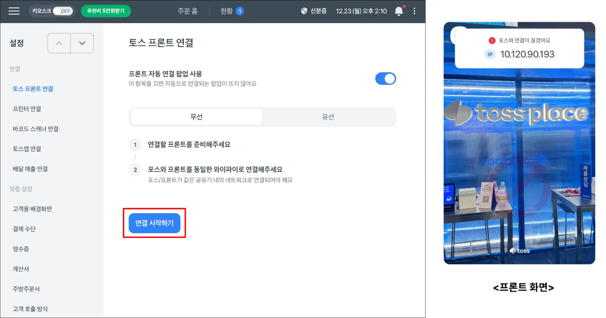 포스와 프론트를 같은 와이파이로 연결한 뒤, 토스포스 앱을 실행 해주세요.