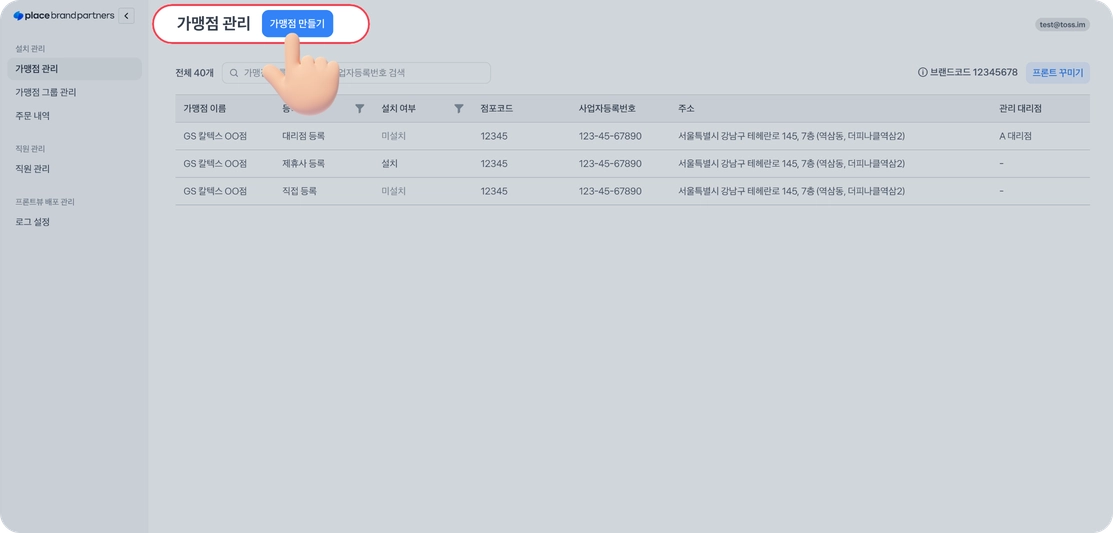 가맹점 관리 메뉴에서 가맹점 만들기 버튼을 눌러주세요.