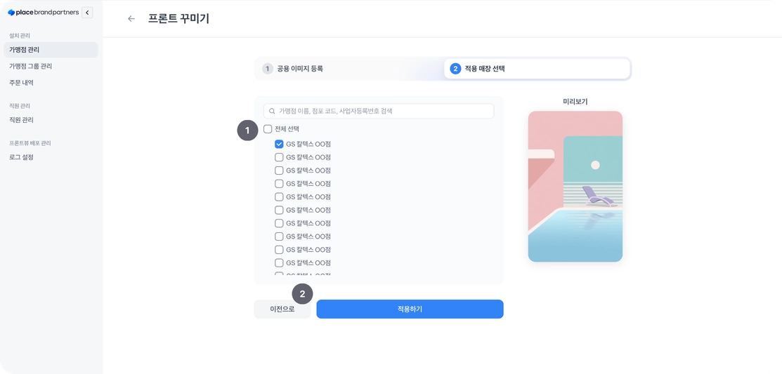 적용할 매장을 선택하고 적용하기 버튼을 눌러주세요.