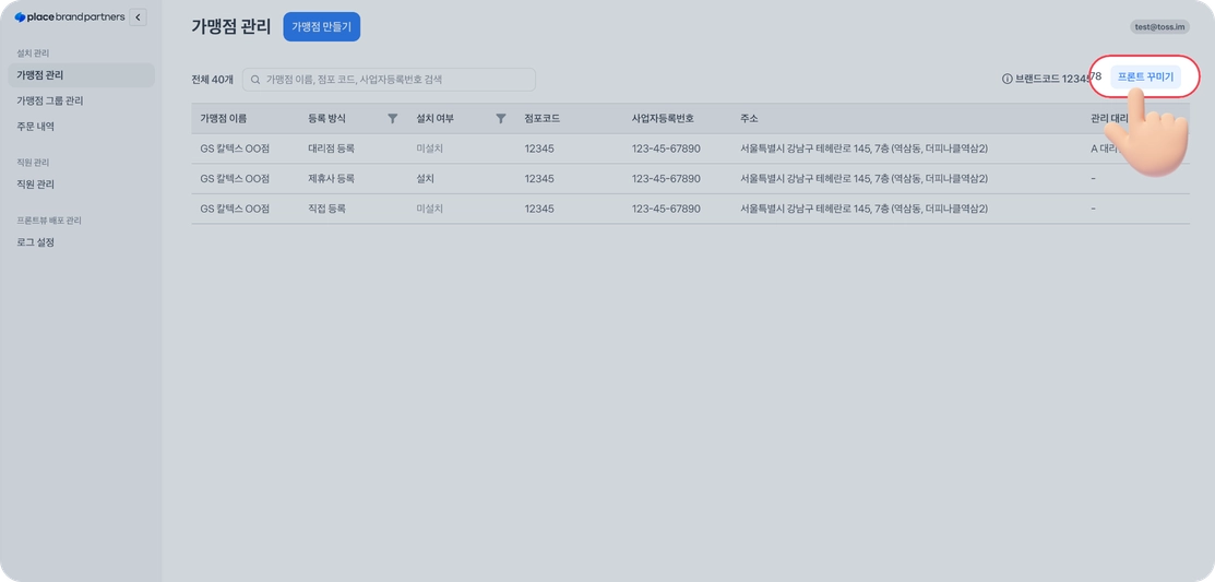 가맹점 관리 메뉴에서 프론트 꾸미기 버튼을 눌러주세요.