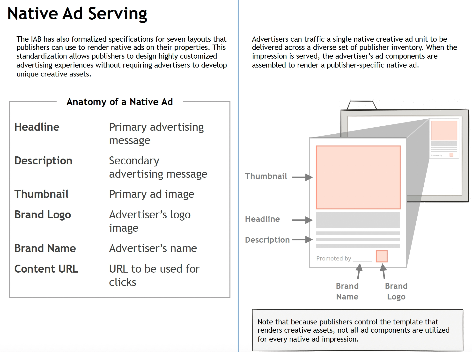 IAB 표준 7가지 레이아웃 존재 (예: 썸네일, 제목, 설명, 브랜드명 등 조합)