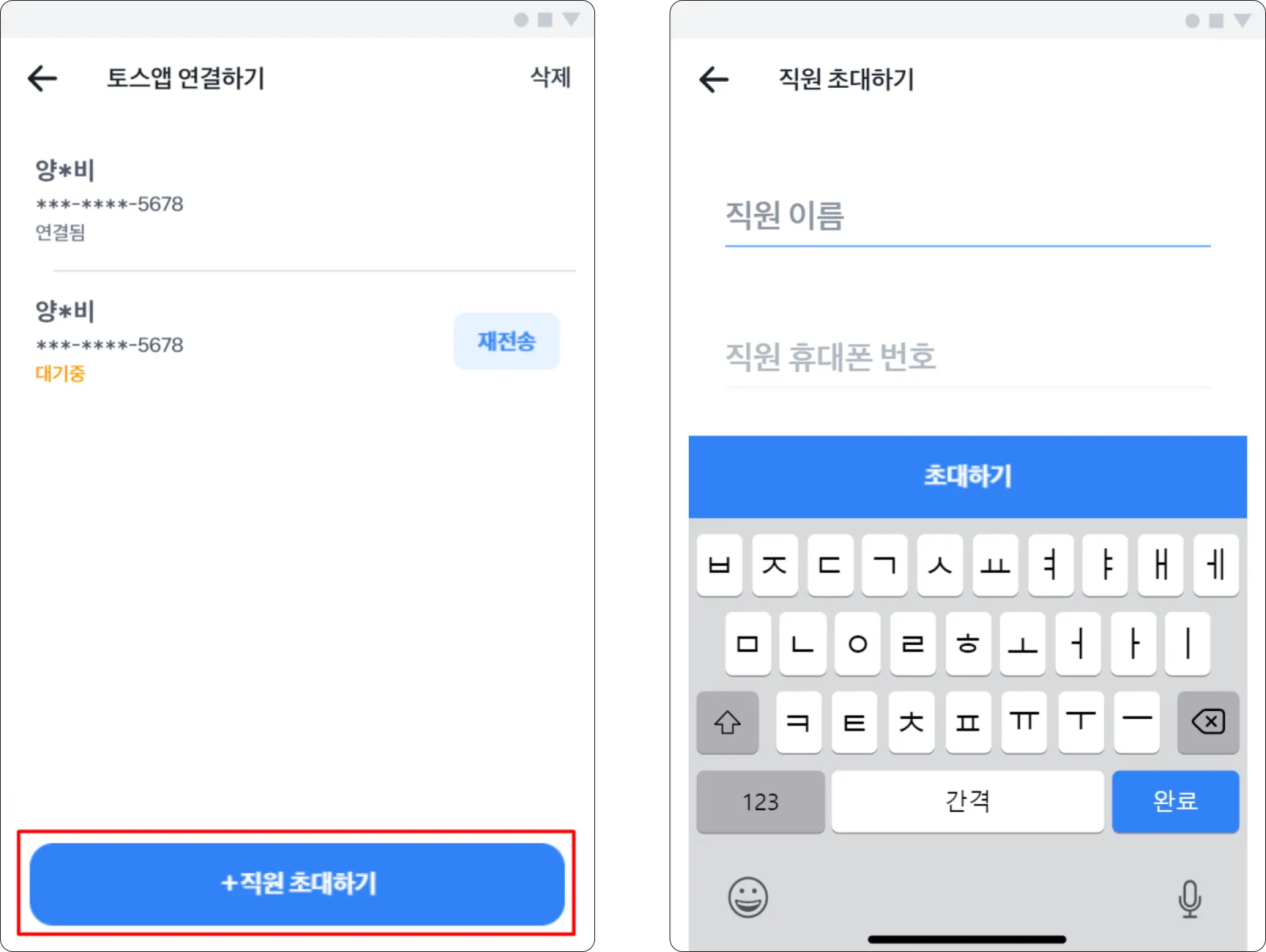 터미널 왼쪽 상단 ≡버튼 > 설정 > 토스앱 연결하기 > 직원 초대하기를 선택해주세요.