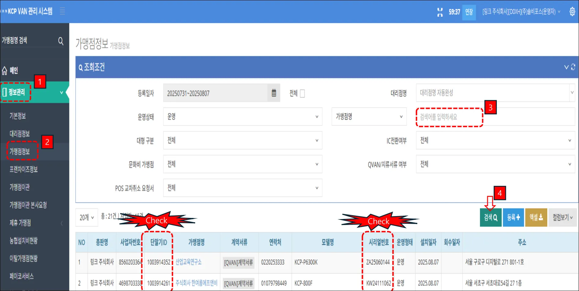 정보관리 → 가맹점정보 → 가맹점명 검색 → 단말기ID와 시리얼번호 확인