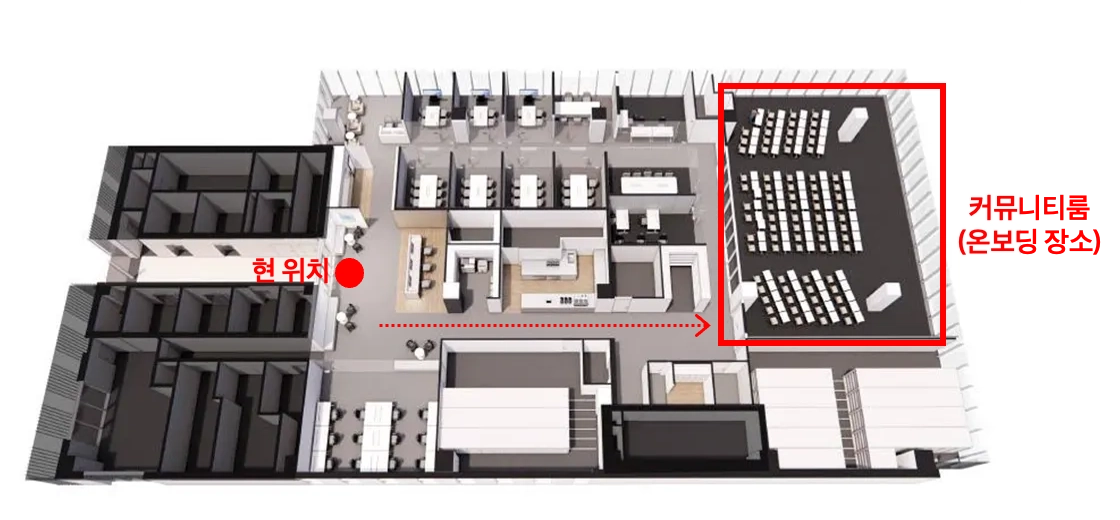 엘리베이터에서 내린 후 직진하면 온보딩 장소인 커뮤니티룸에 도착 할 수 있어요!