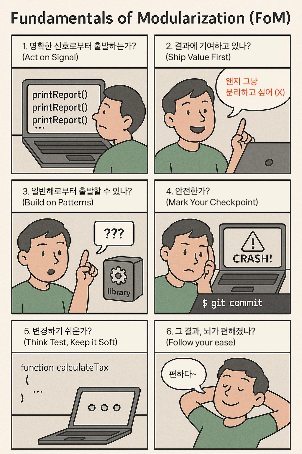 그래서 FoM(Fundamentals of Modularization) 이라는 이름으로 좋은 코드를 작성해나가는 메커니즘을 정리해보았습니다.