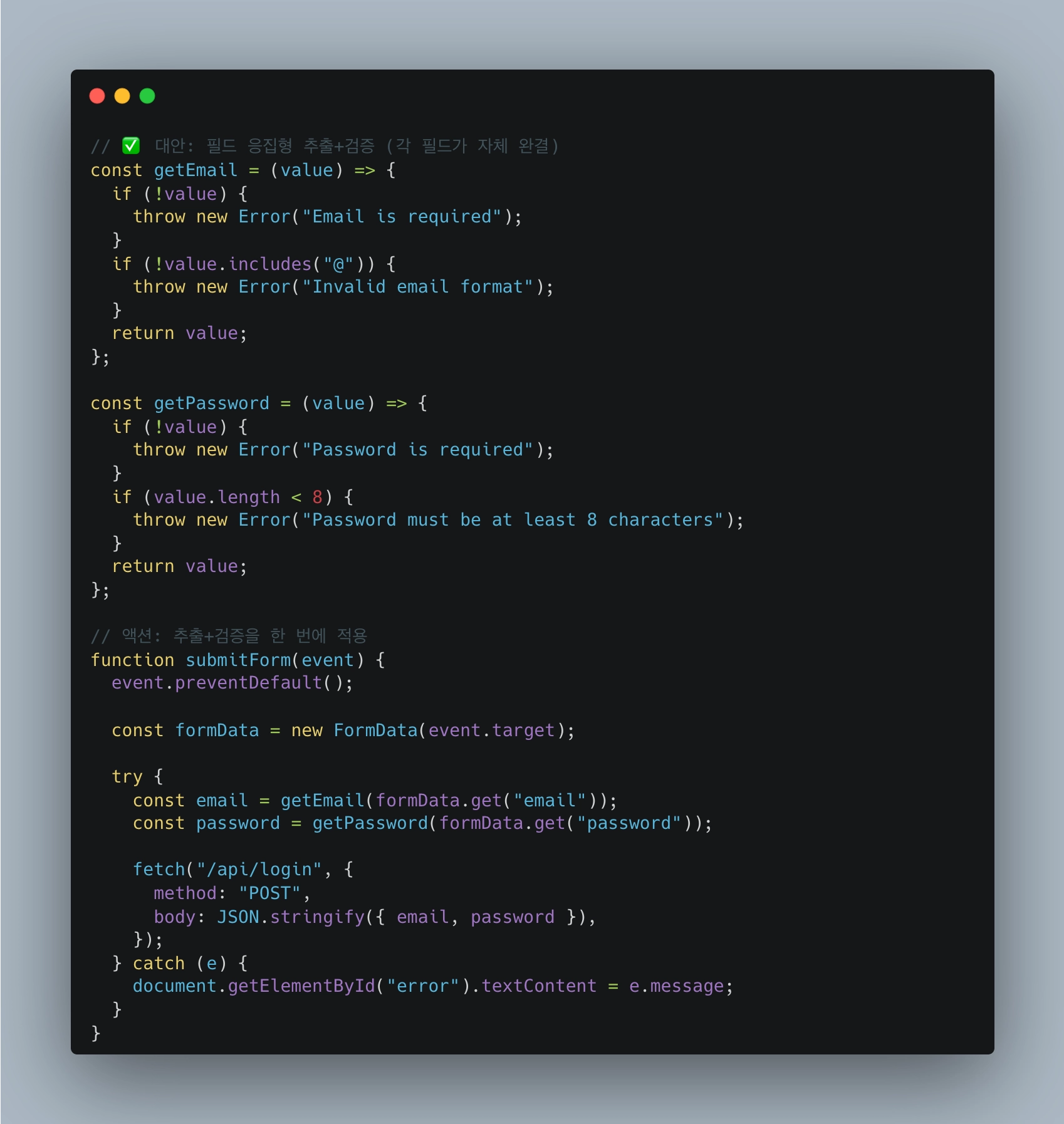 ex2. “form으로 받은 데이터 A를 B로 만드는 동안, 1) 각 필드에 대한 유효성 검사를 한 뒤 2) 특정 필드의 포매팅해야 해. 유효성 검사는 zod schema에서 예외를 던지게 해 catch에서 잡아서 처리하고, 포매팅의 경우 계산 함수에서 책임지도록 할거야.”