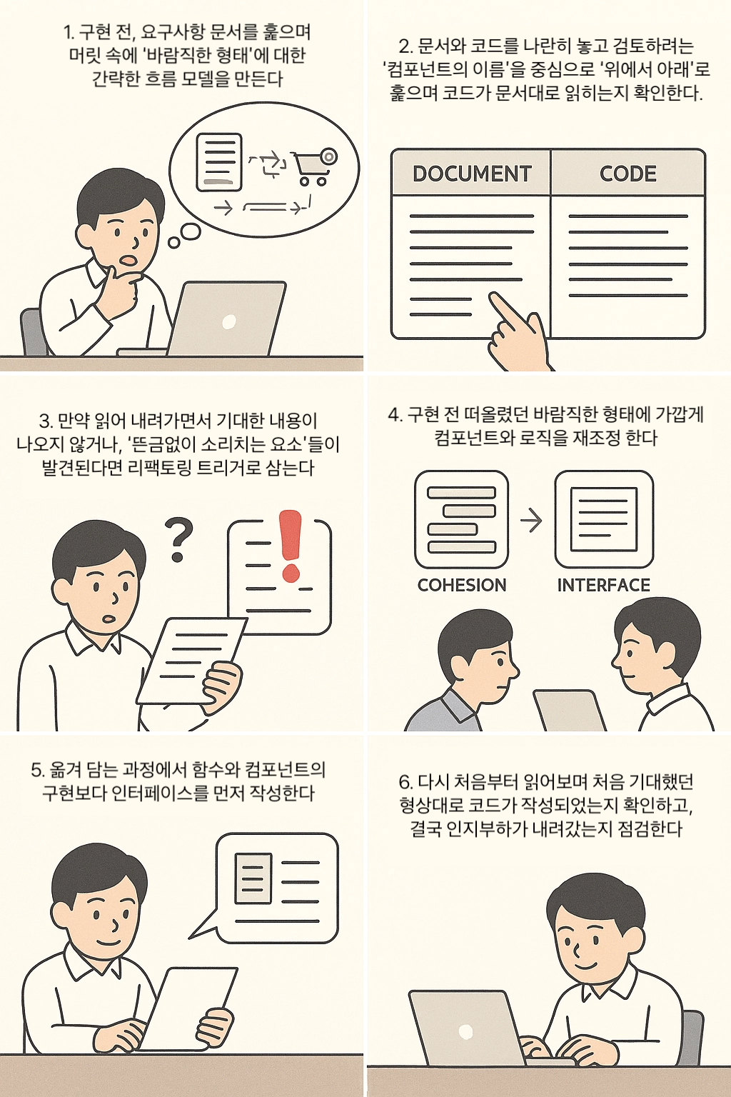 [요구사항 문서][머릿속 모델 구성][코드 읽기 시작][위에서 아래로 흐름] ↓ 예상과 일치? ──No──→ [리팩토링 트리거] ↓ Yes ↓ [다음 섹션] [재조정 & 분리] ↓ ↓ 완료 [다시 읽기]
