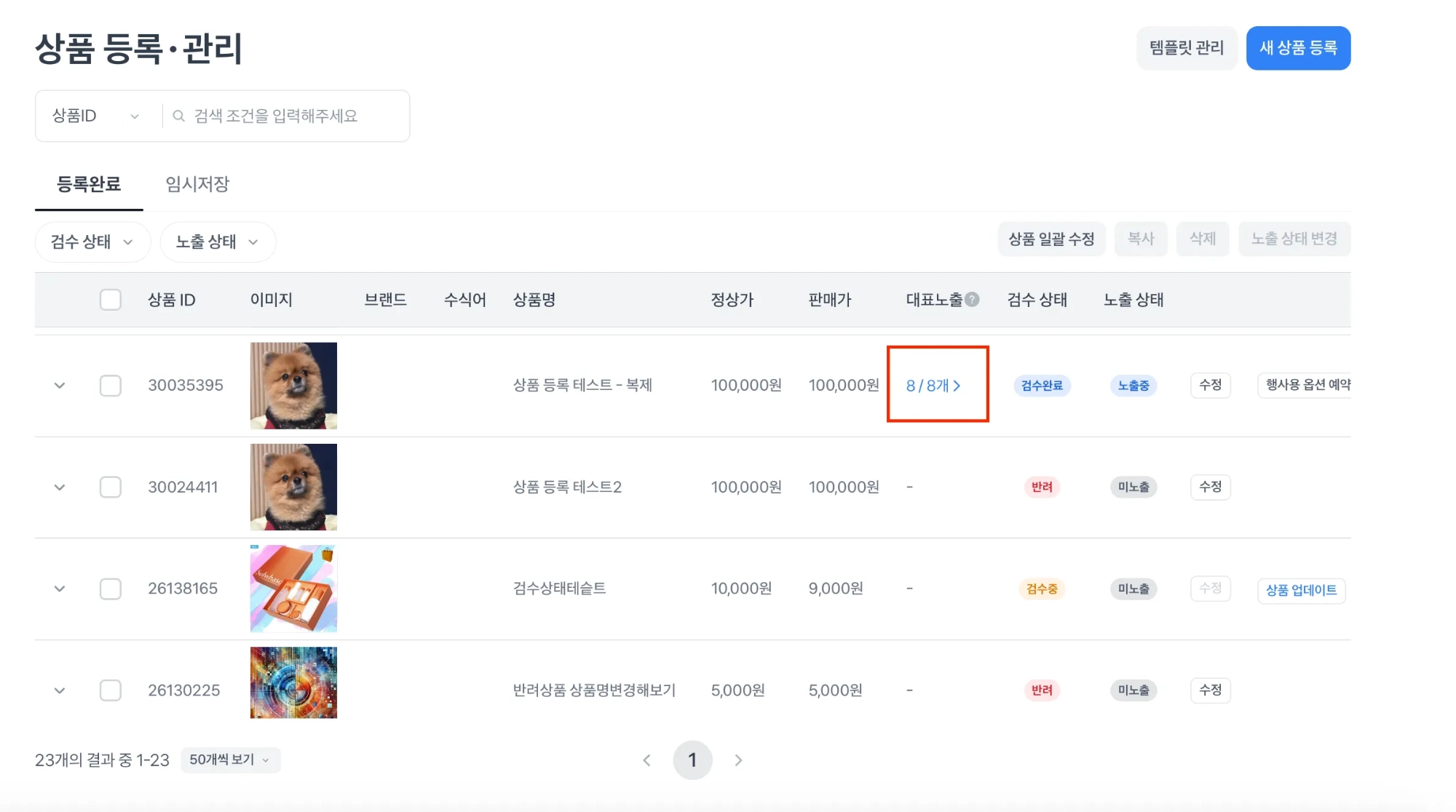 검수완료, 노출중 , 대표노출 상태