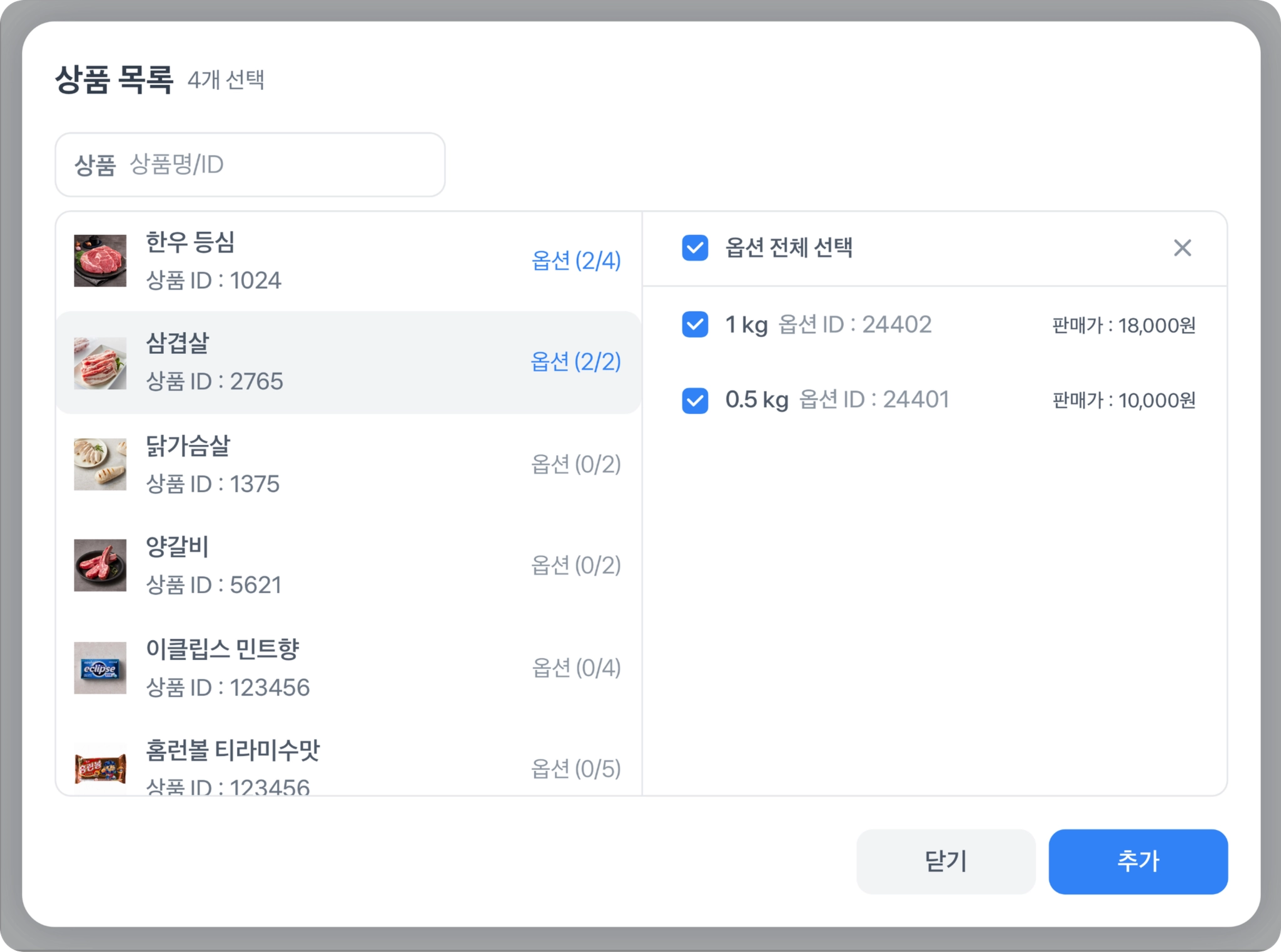 상품 목록에서 옵션을 선택해주세요. (옵션 추가 → 상품 클릭)