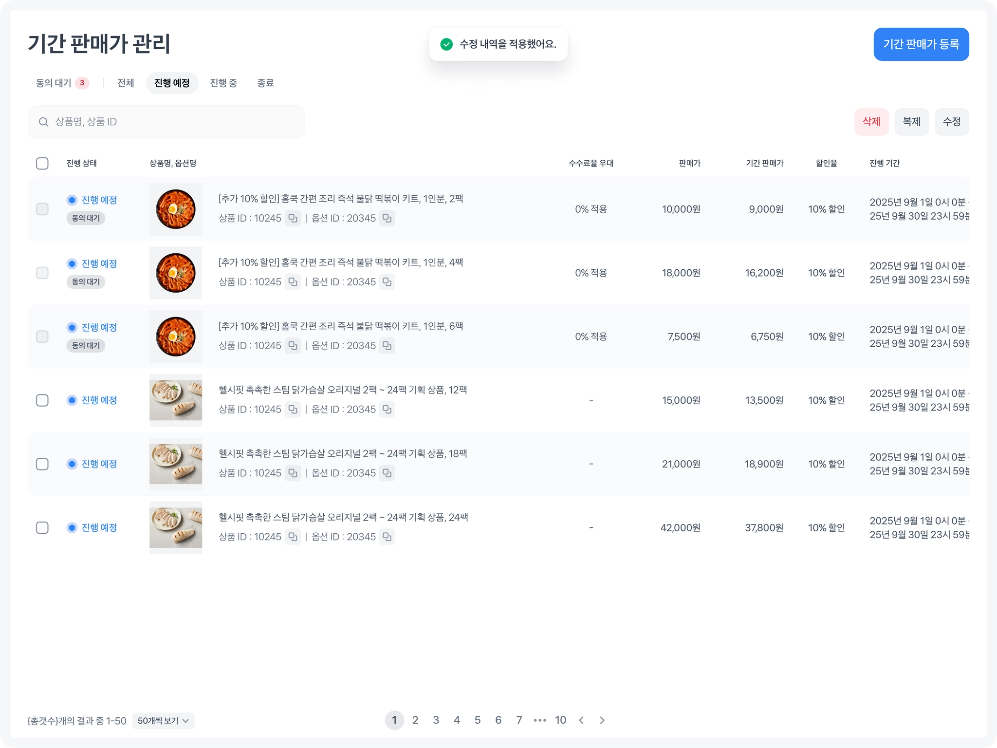 기간 판매가 관리 탭에서 새로 추가한 진행 예정 건을 확인할 수 있습니다.