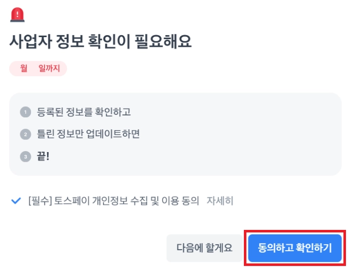 [사업자 정보 확인이 필요해요] 화면 내 “동의하고 확인하기”를 클릭 후 최초 토스페이에 계약해주신 대표자 분의 정보를 입력 후 인증을 진행해주세요.