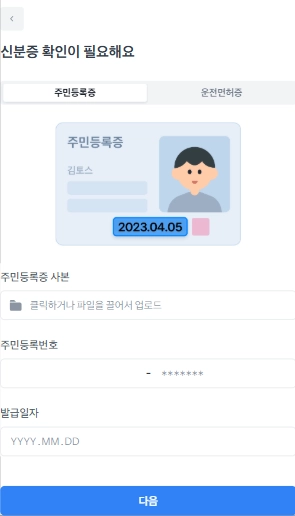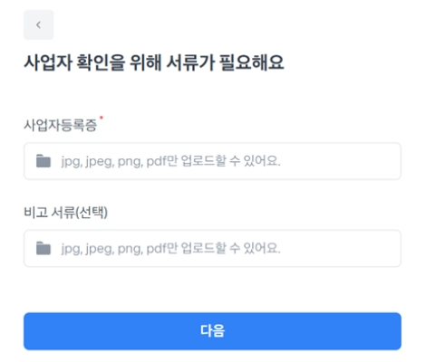 [신분증 확인이 필요해요]화면을 만나보시지 못한경우, [사업자 확인을 위해 서류가 필요해요] 화면에서 사업자등록증만 제출해주셔도 돼요.