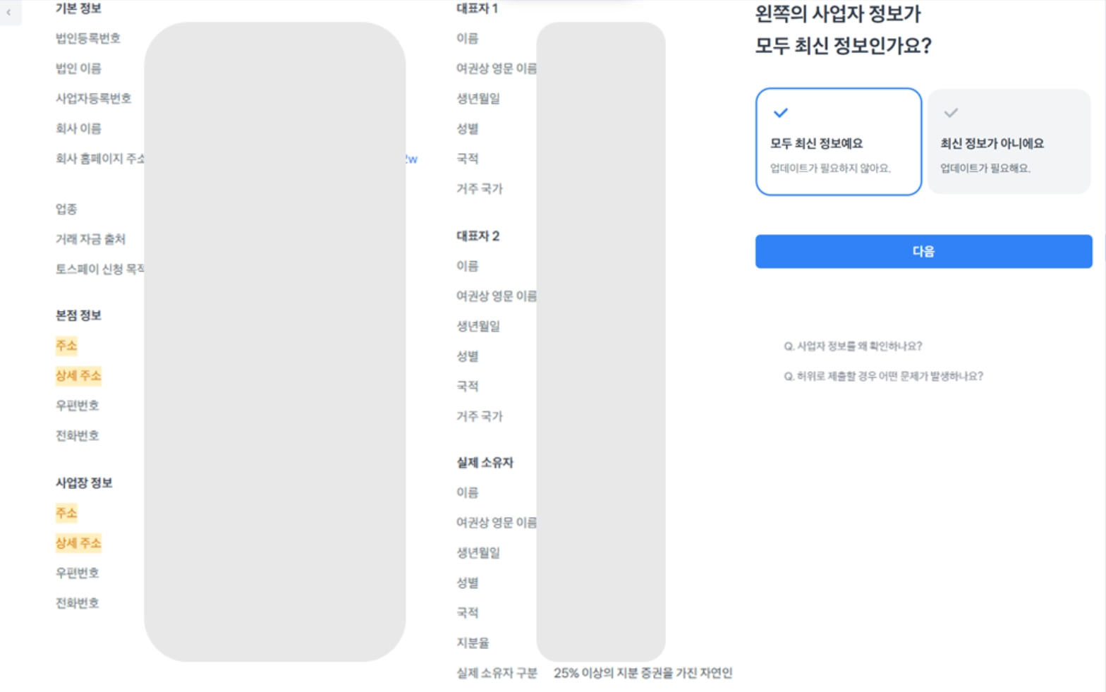 기본 정보와 대표자 정보를 확인 후 최신 정보 여부를 선택해주세요.