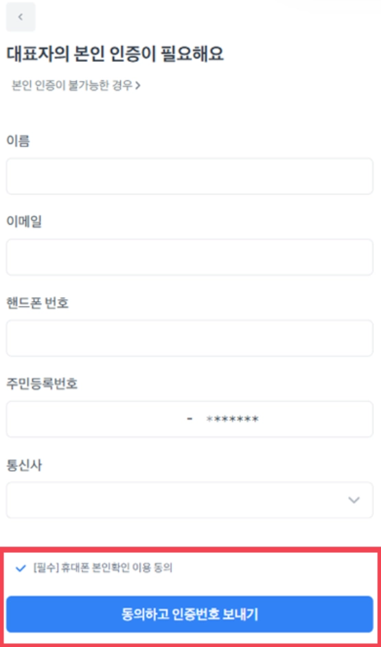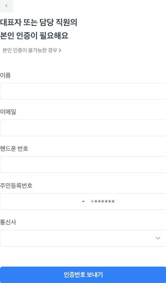 본인인증을 할 수 없으시다면 [대표자의 본인 인증이 필요해요] 하단 “본인 인증이 불가한 경우” 를 클릭해주세요. 우편으로 보내주실 서류를 안내해드릴게요.