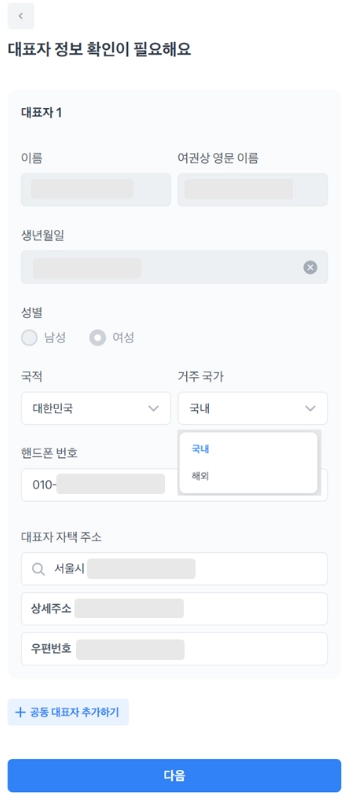공동 대표자가 있다면 [대표자 정보 확인이 필요해요] 화면하단 +공동 대표자 추가하기를 통해 추가해주세요.