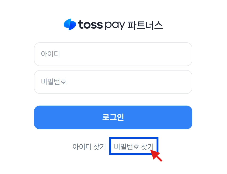 토스페이 파트너스 로그인 화면 아래에 ‘비밀번호 찾기’를 통해 비밀번호를 새롭게 설정할 수 있어요.