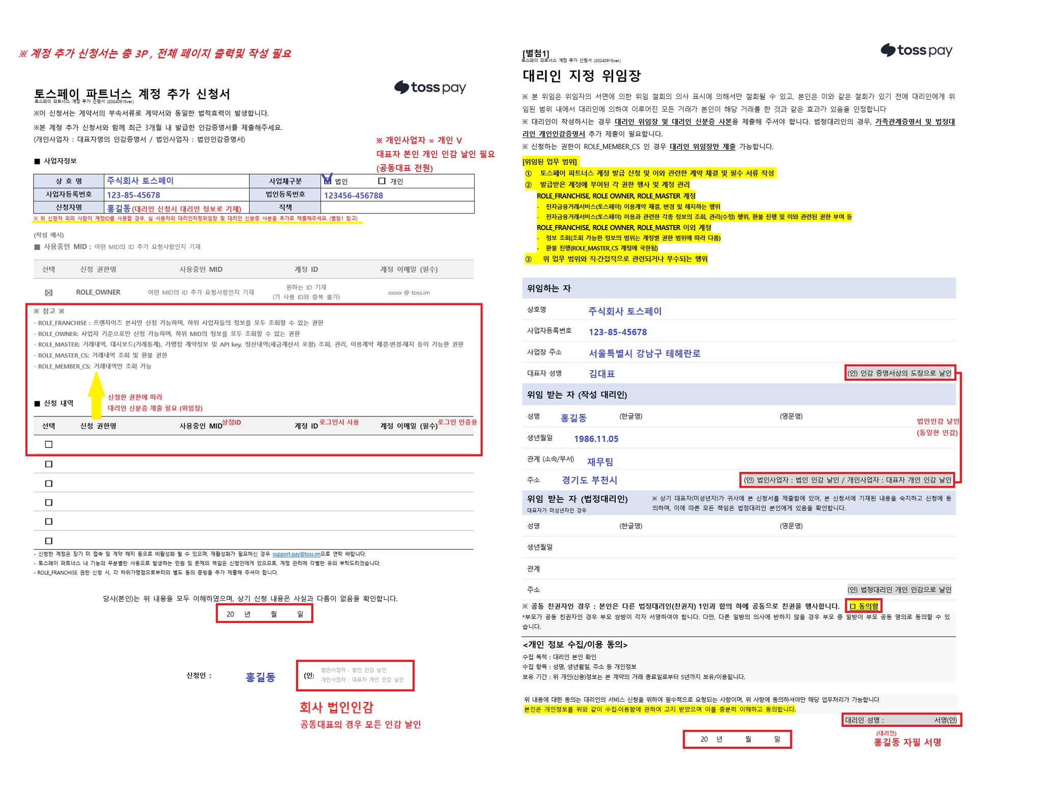 토스페이 파트너스 계정(ID) 추가 신청서 - 법인의 경우 회사 법인 인감으로 날인해주세요.