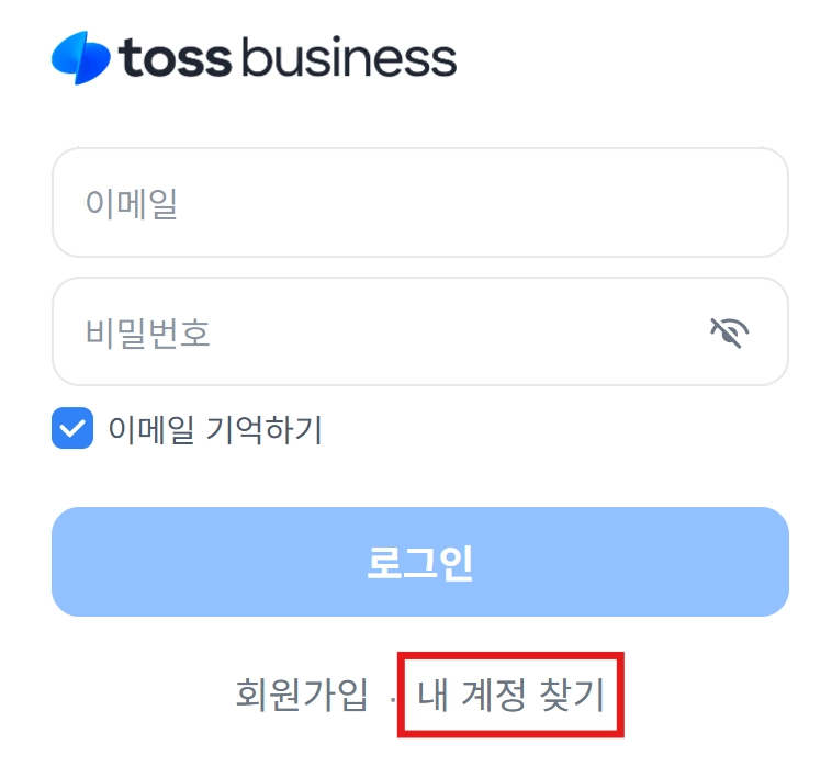 토스 비즈니스 로그인 화면 하단의 [내 계정 찾기]를 통해 본인인증 후 계정을 찾을 수 있어요.