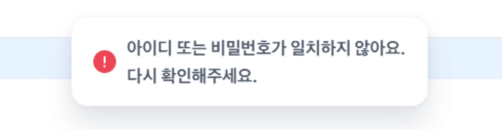 아이디 또는 비밀번호가 일치하지 않아요. 다시 확인해주세요.