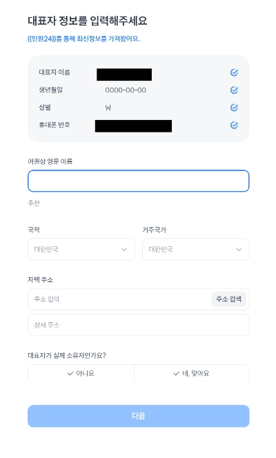 여권상 영문 이름, 주소를 입력해주시고 대표자가 해당 사업자의 실제 소유자인지 선택해주세요.