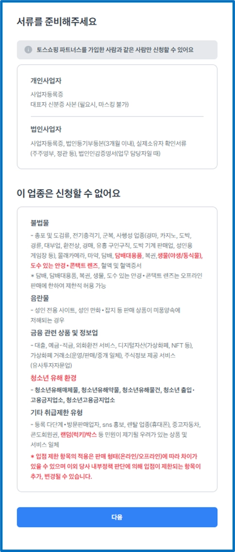 토스페이를 신청할 수 없는 업종을 확인해 주세요.