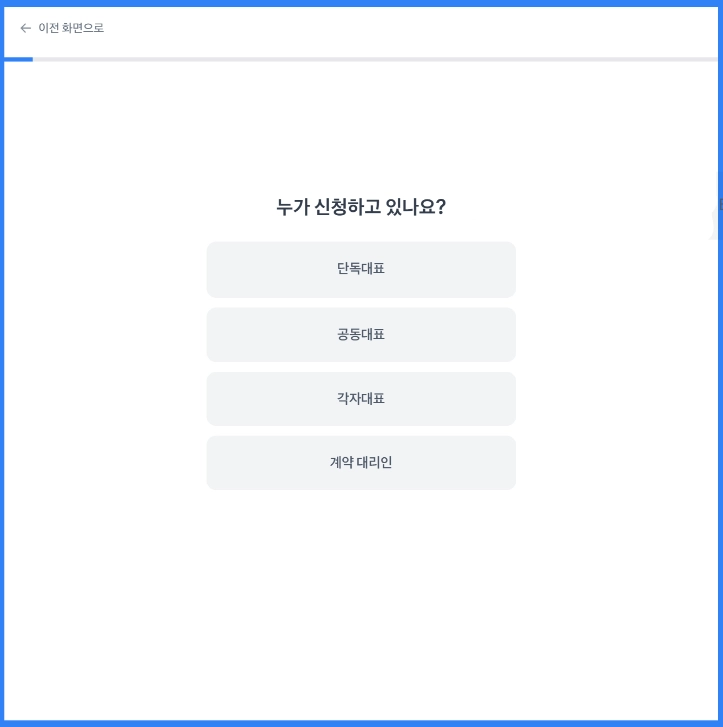 개인사업자는 대표자만 신청할 수 있어, 계약 대리인은 신청이 불가해요.