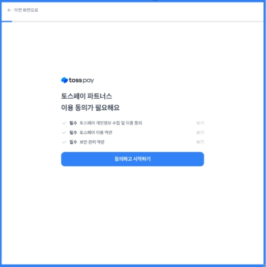 토스페이 파트너스 신청을 위한 필수동의를 확인하고 다음 버튼을 눌러주세요.