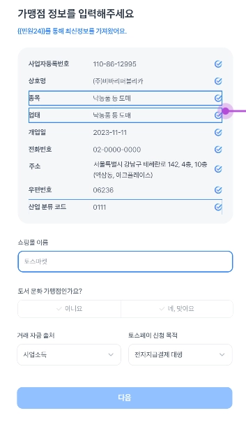 사업자등록증과 동일하게 가맹점 정보가 입력되었는지 확인해주세요.