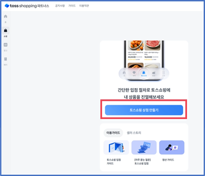 상점과 연결된 계정으로는 상점을 추가할 수 없어 새로운 토스 비즈니스 계정을 생성 후 토스쇼핑 상점만들기를 클릭해 주세요.