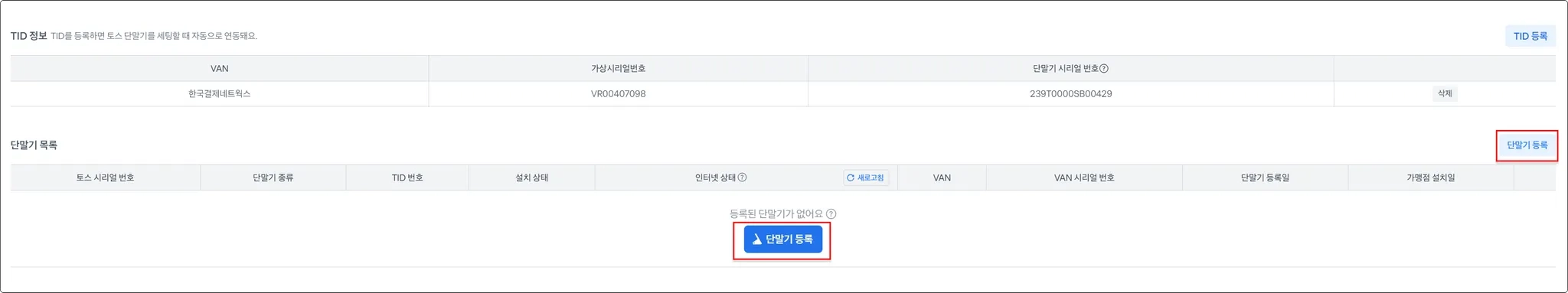 TID 등록이 완료되었다면, 하단의 단말기 목록에서 단말기 등록을 선택해주세요.