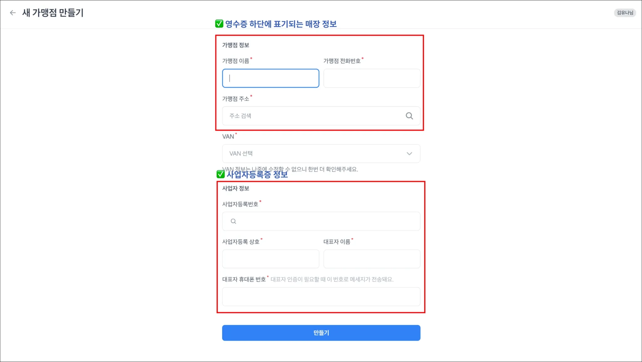 새 가맹점 만들기 에 필요한 필수 정보를 입력하고, 만들기를 클릭해요.