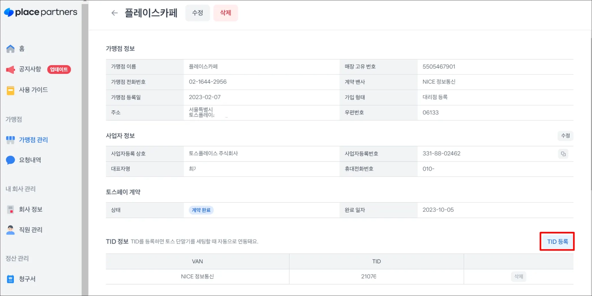 생성된 매장의 정보에 접속하여, 가운데 위치한 TID 등록 버튼을 클릭해주세요.