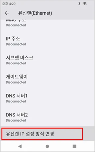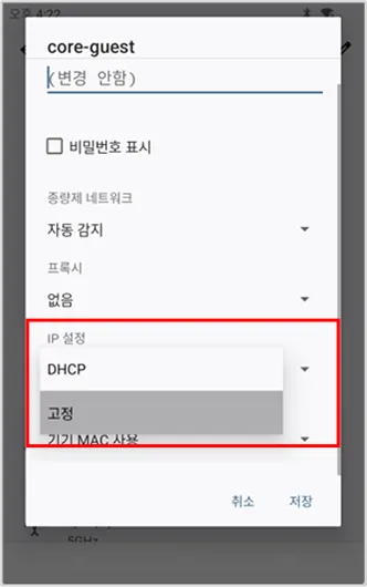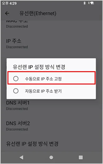 하단의 유선랜 IP 설정 방식 변경에 진입하여 수동으로 IP 주소 고정 설정 → 고정 IP를 선택해주세요.