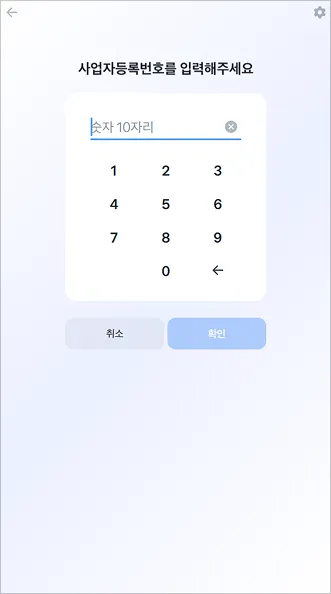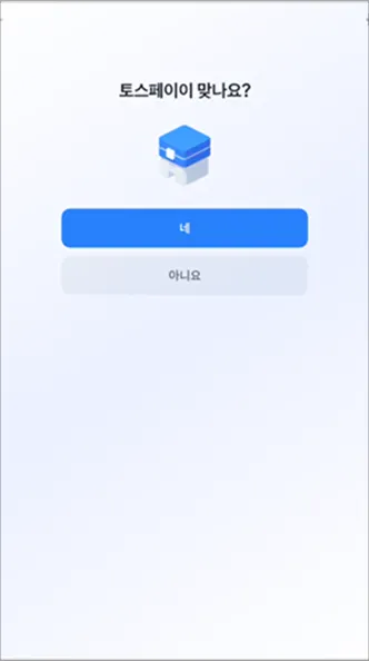 미러링 된 화면을 토대로, 키오스크에서 토스 앱을 실행시켜주세요. 왼쪽 화면과 같이 최초 세팅을 위한 첫 화면이 보여져요.