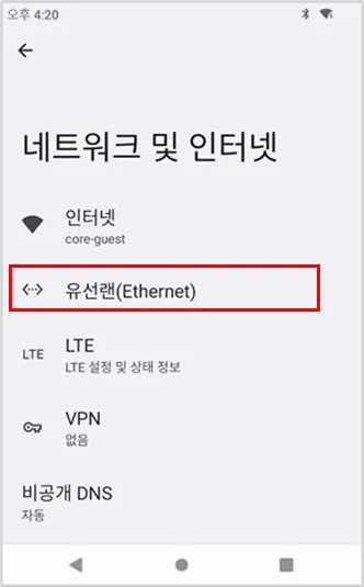 인터넷 연결을 선택하고, 유선랜을 클릭해주세요.