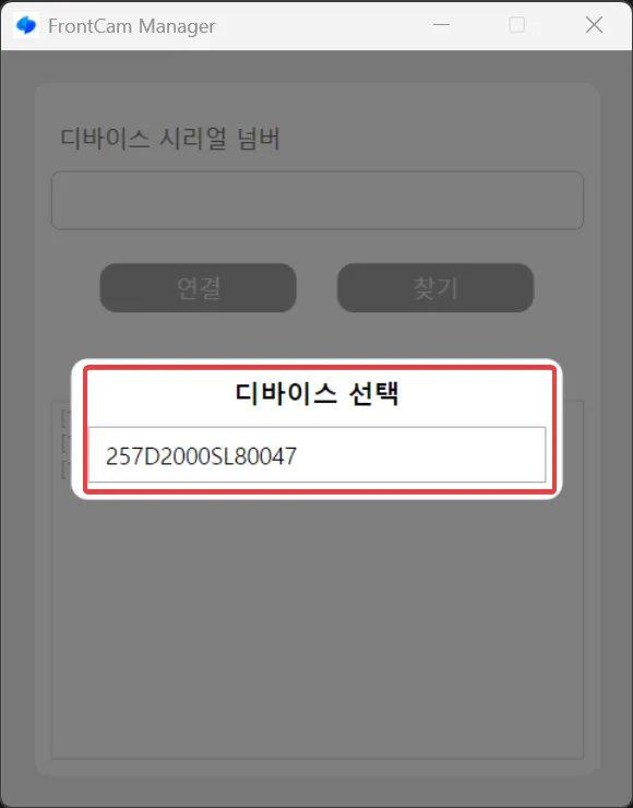 이후 연결된 프론트 캠이 검색되며, 화면에서 설정하고자 하는 프론트 캠의 시리얼 넘버를 선택해주세요.
