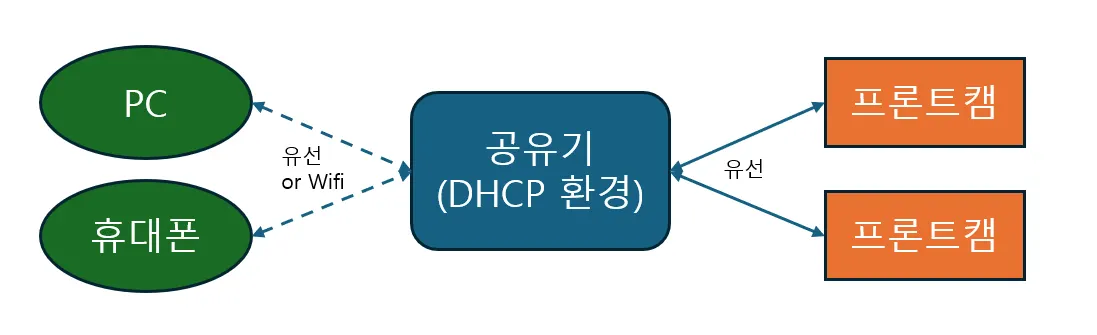 무선 공유기(DHCP 환경) 에 유선 LAN으로 연결을 진행해주세요.