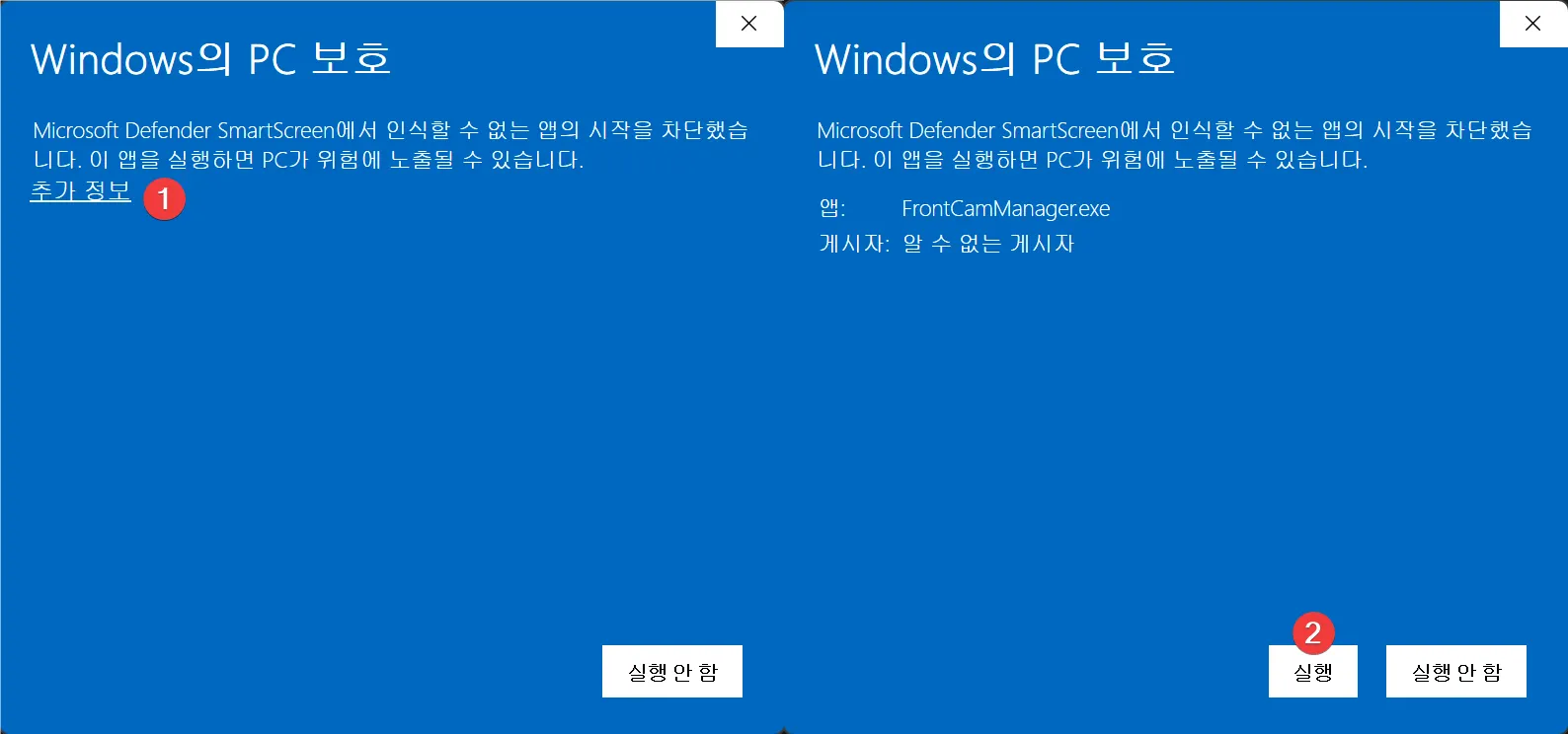 왼쪽 이미지처럼, 윈도우 환경에서 앱의 시작을 차단하는 경우가 있어요. 이런 경우에는 추가정보 → 실행 버튼을 눌러 파일을 강제 실행 시켜주세요.