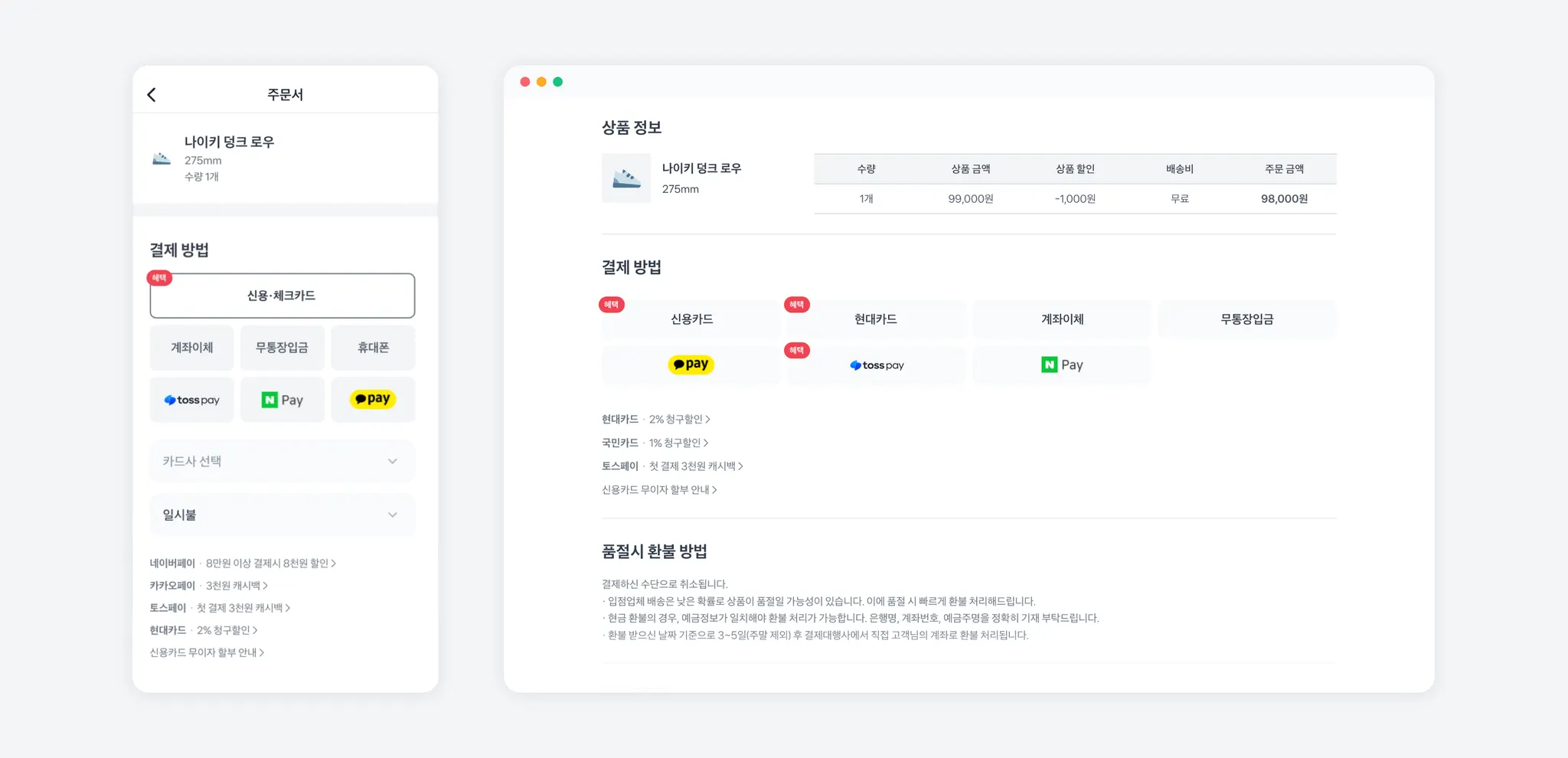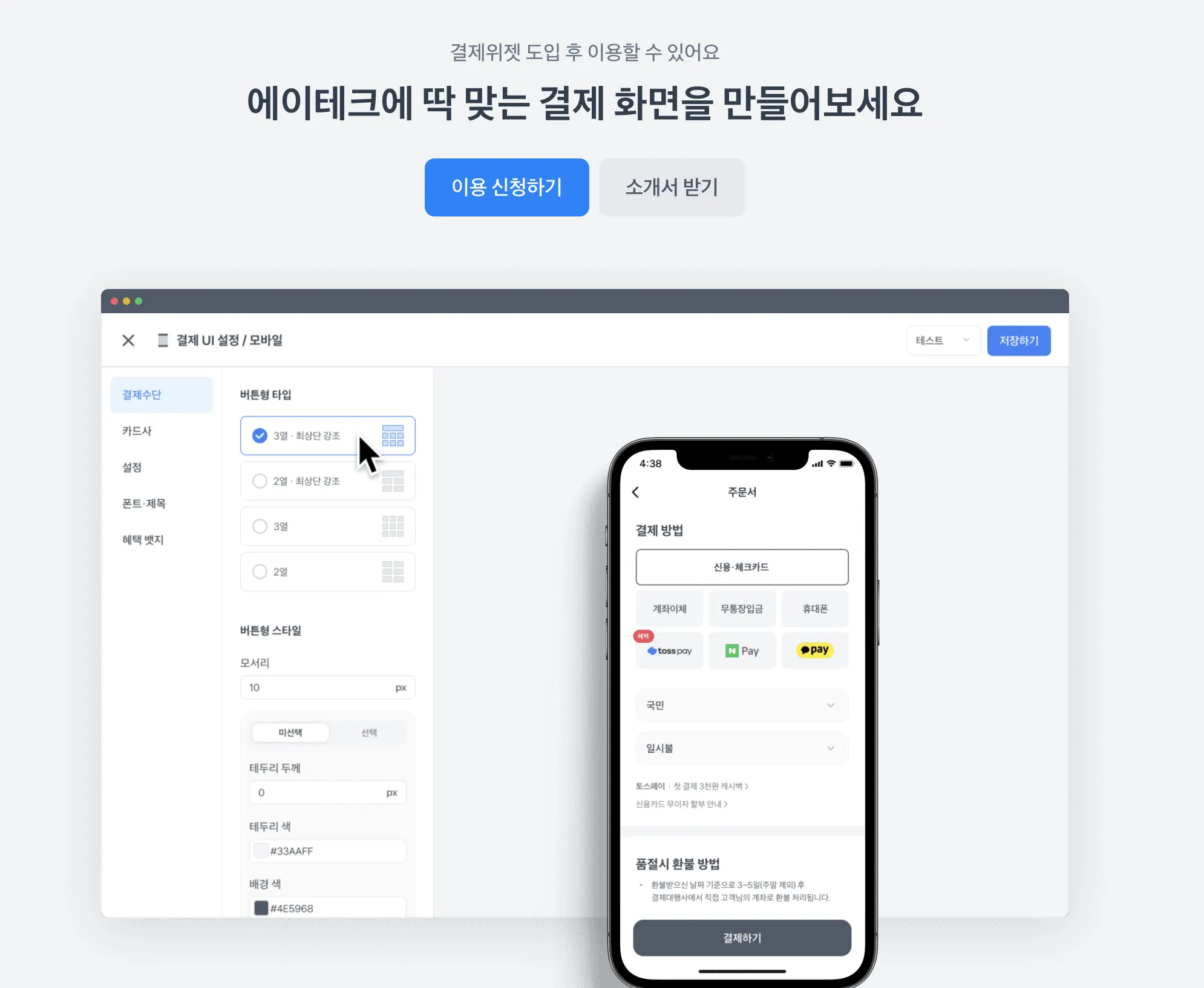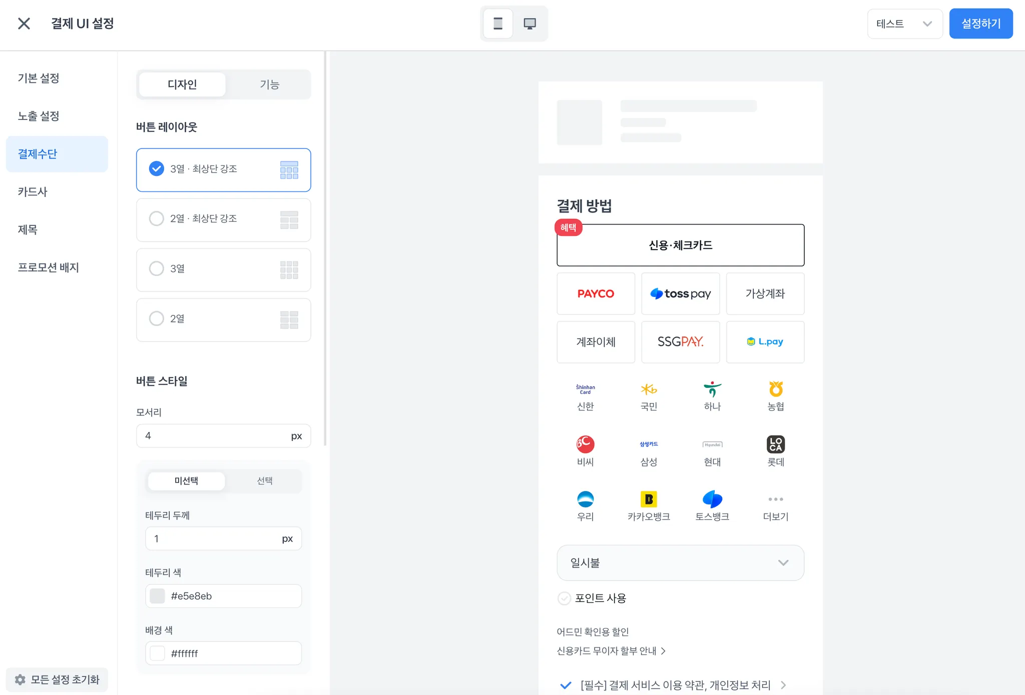 추가 개발 없이 상점관리자에서 결제수단 목록, 레이아웃, UI 등 다양한 옵션을 커스터마이징이 가능합니다.