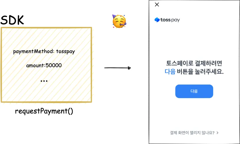 SDK는 동기화된 결제 정보를 가지고 있게 되고 requestPayment 메서드를 실행시켜 결제요청이 가능해집니다.