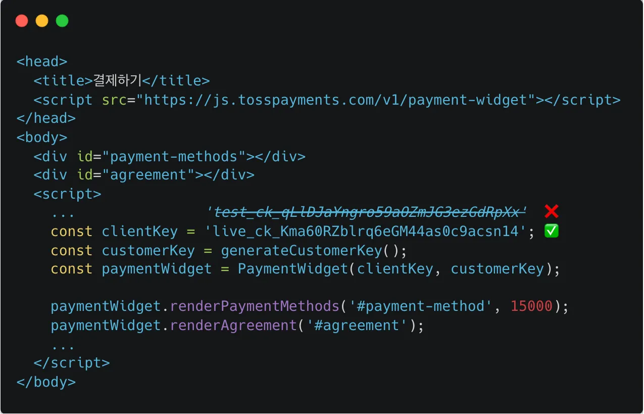 카드사 심사가 끝나고 나면 라이브 클라이언트키가 발급되고, 코드에서 클라이언트키만 바꿔주면 됩니다.