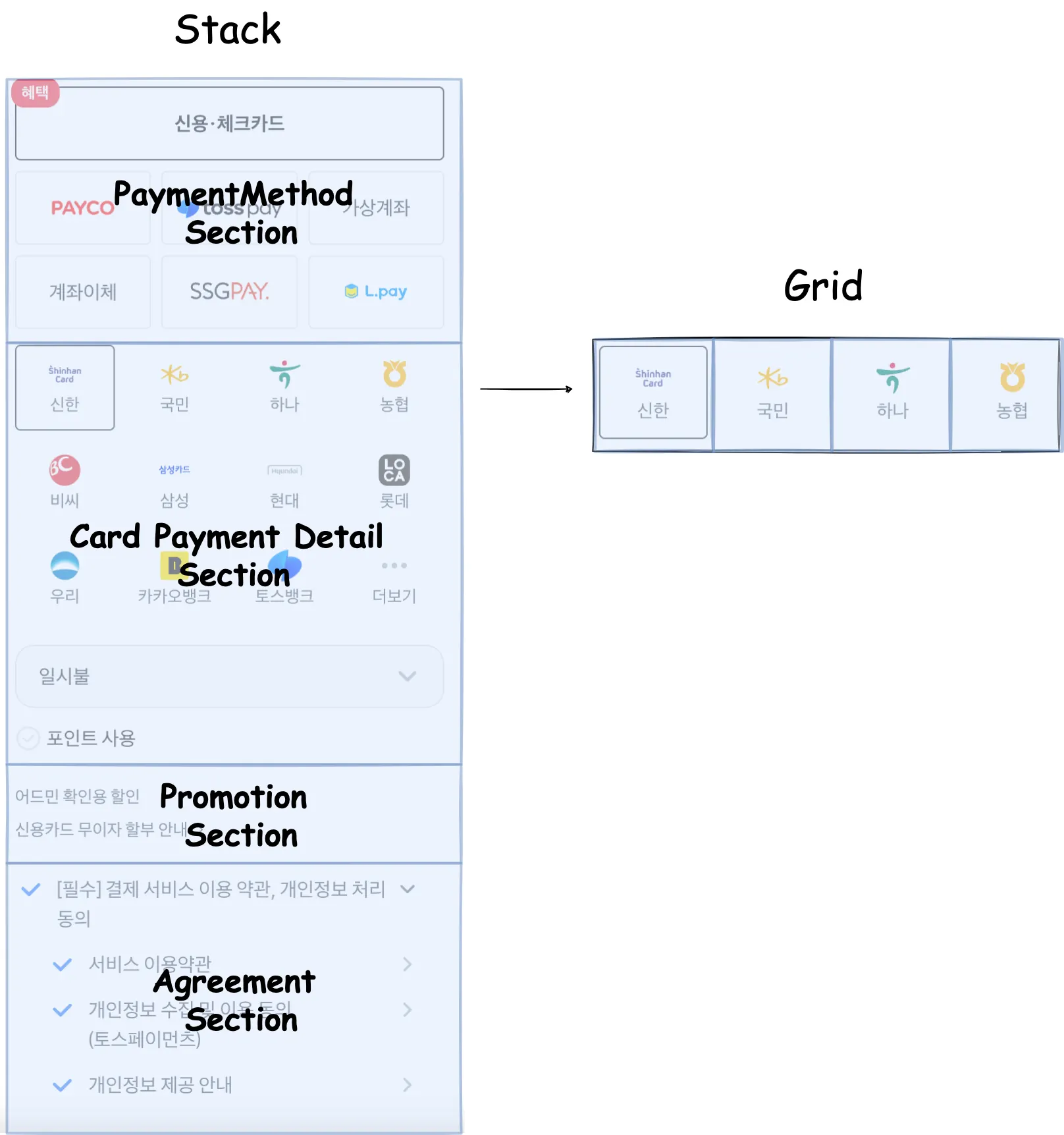 결제수단 Section, 카드 결제 상세 Section, 약관 Section 등 역할에 따라 영역을 나누고 있습니다.