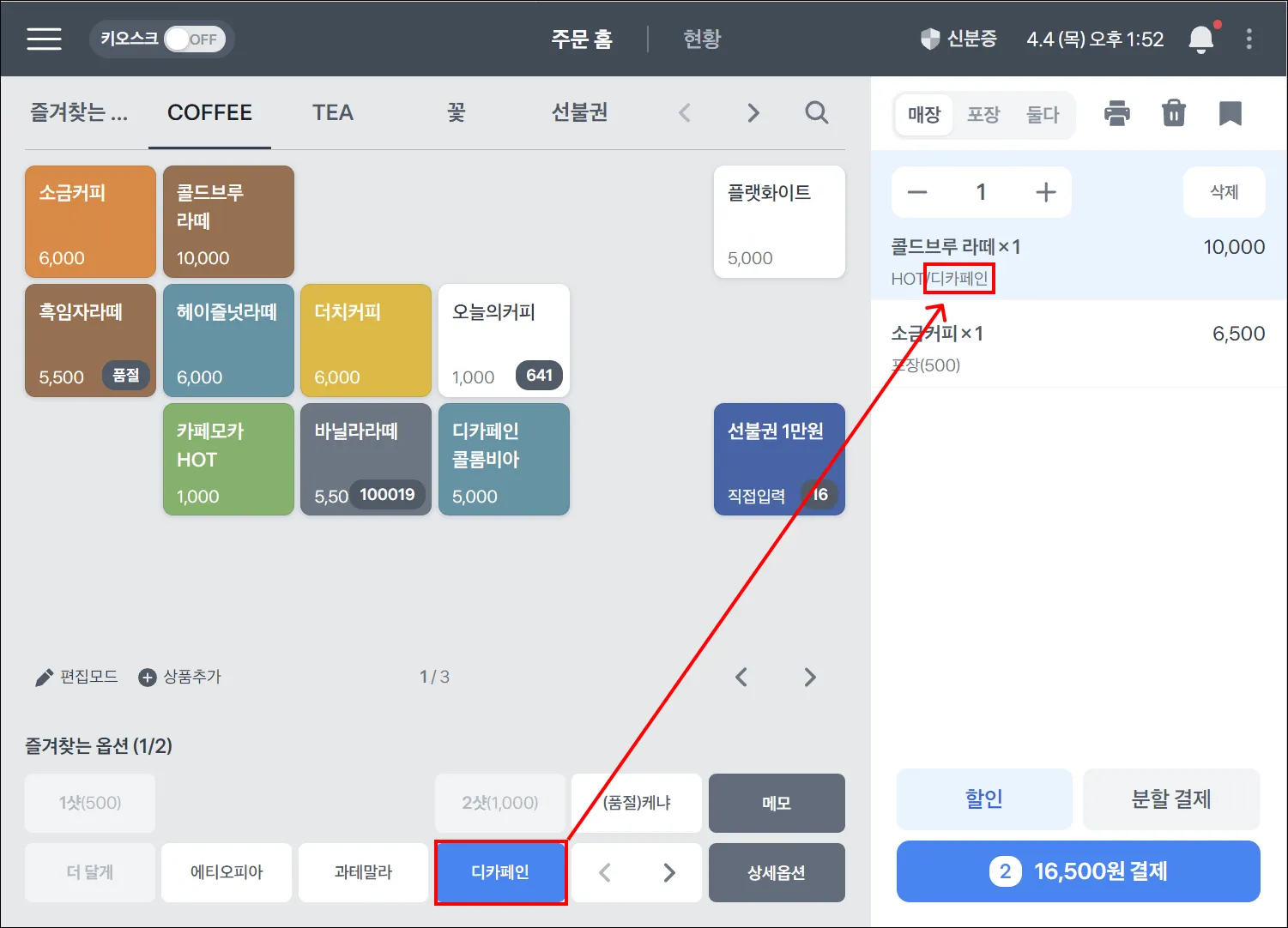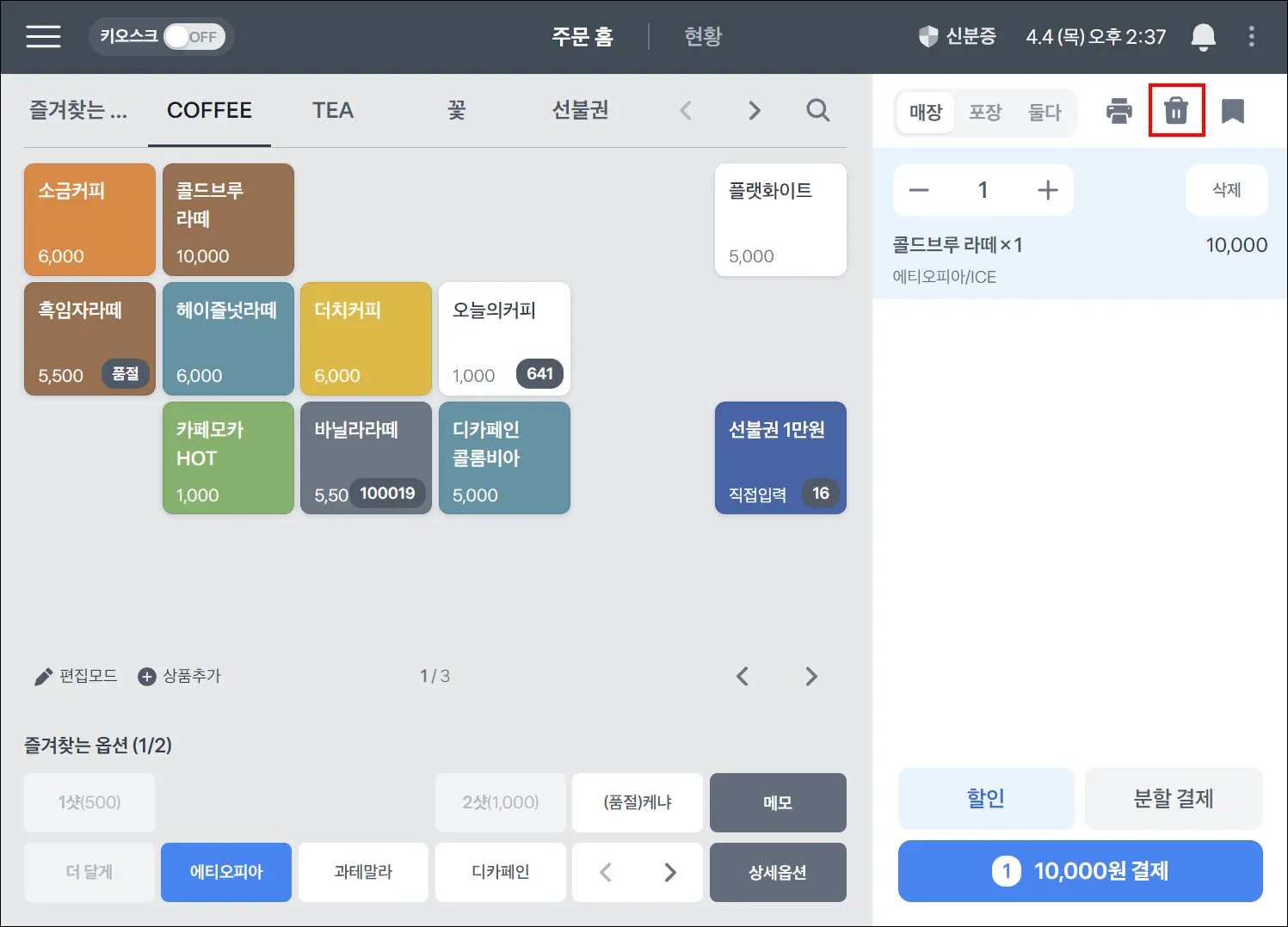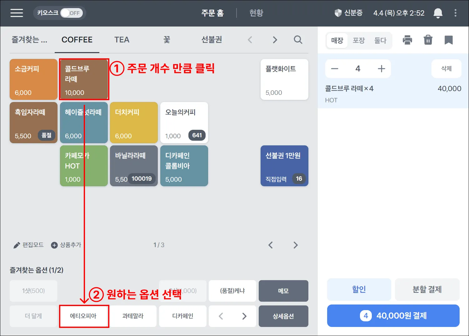 ex. 콜드브루 라떼 4잔 주문 → 콜드브루 라떼 네 번 클릭