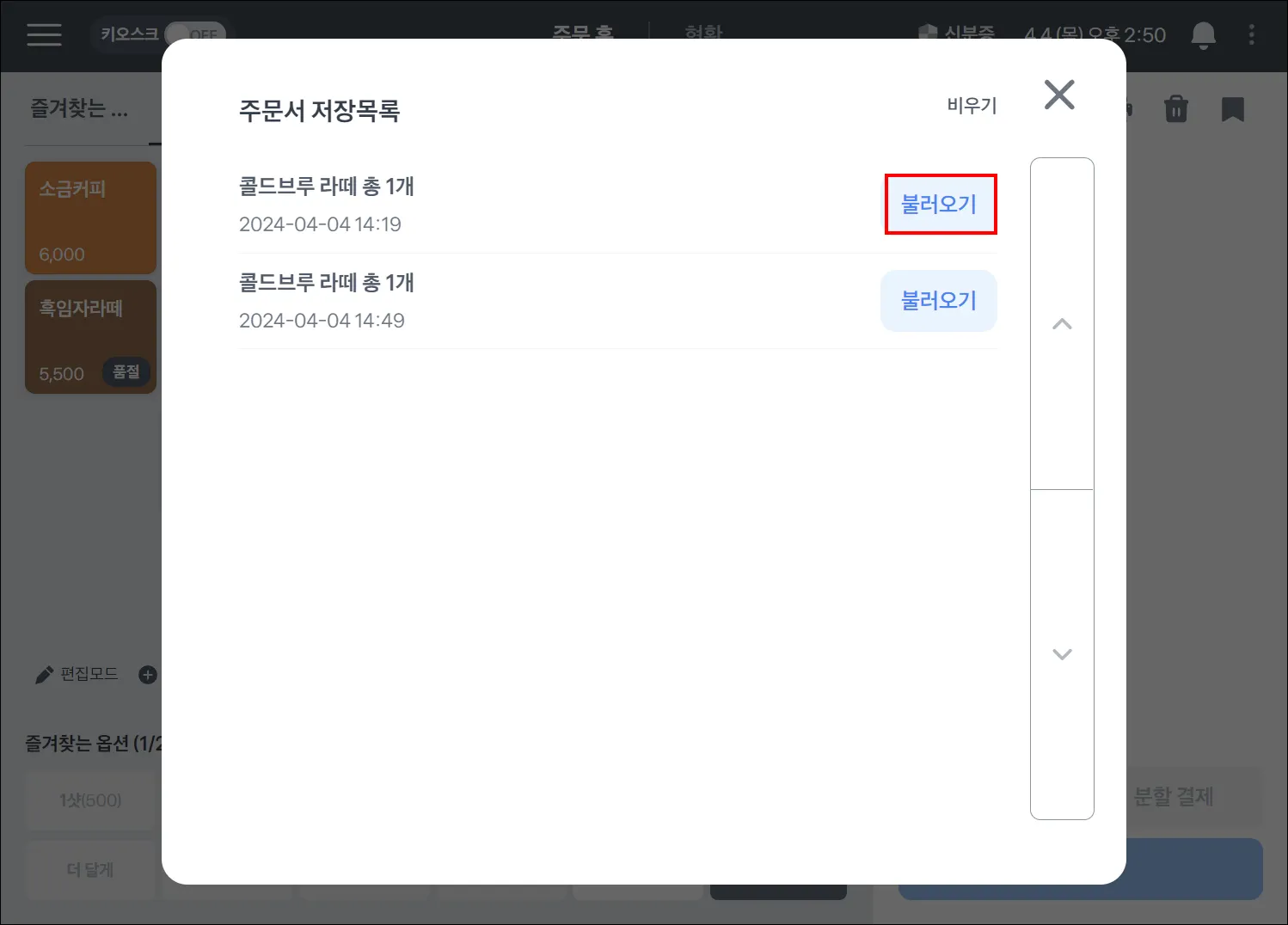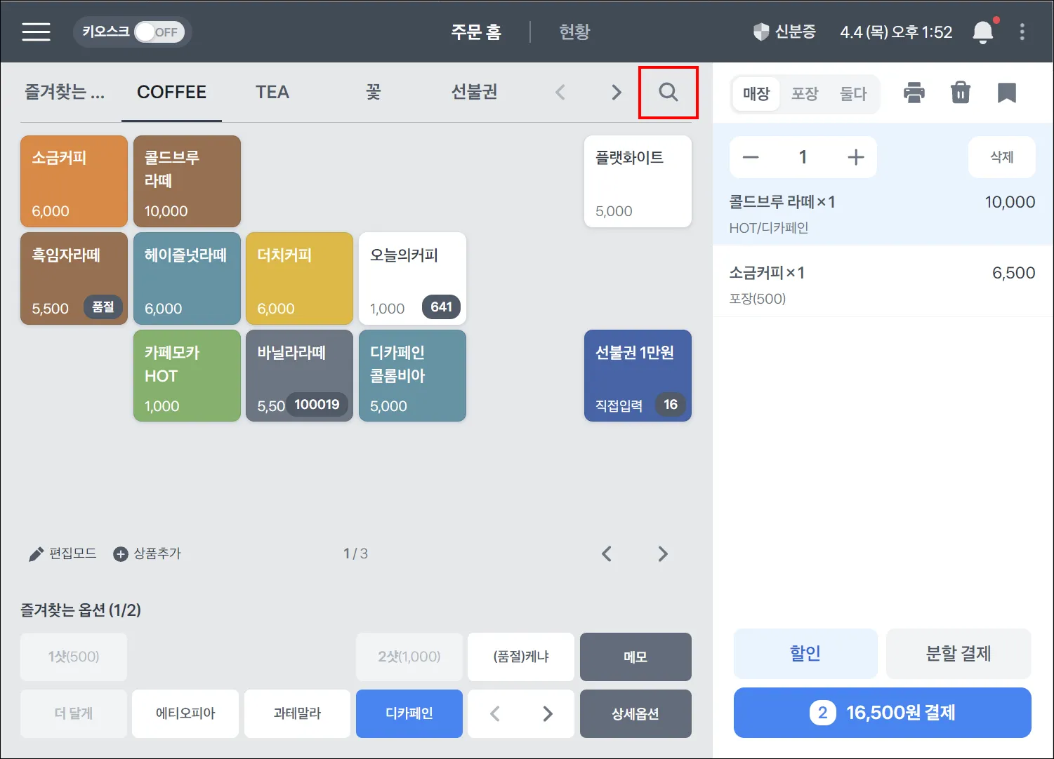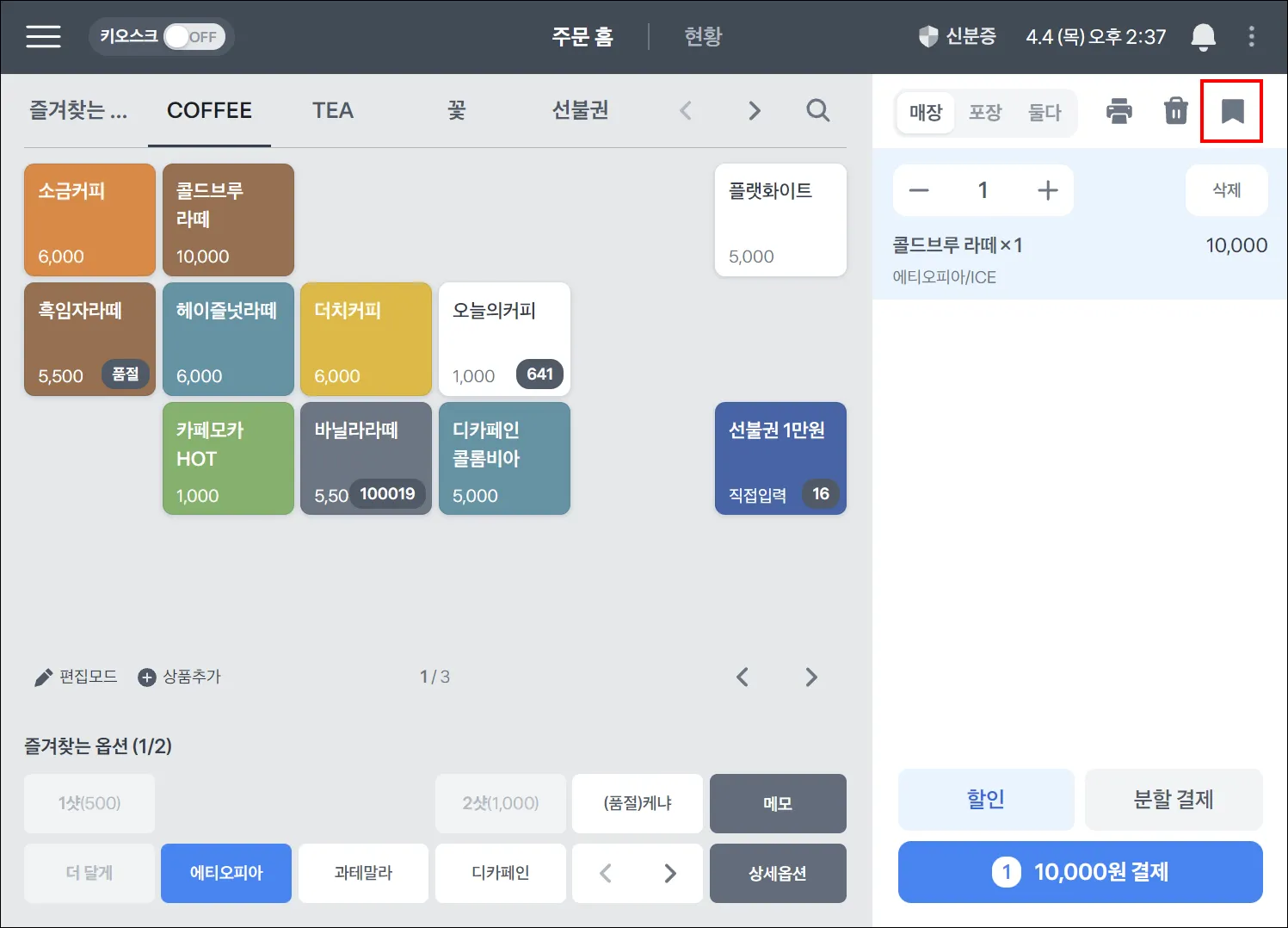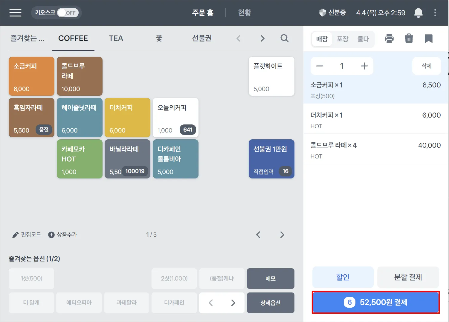 ex. 콜드브루 라떼 4잔 주문 → 콜드브루 라떼 네 번 클릭