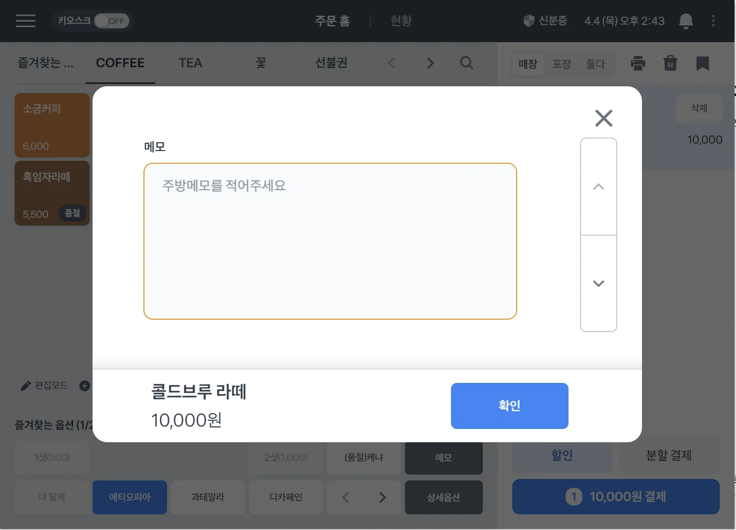 주문한 메뉴에 특이사항을 기재하고 싶다면, 메모 버튼을 클릭하여 메모를 입력할 수 있어요.